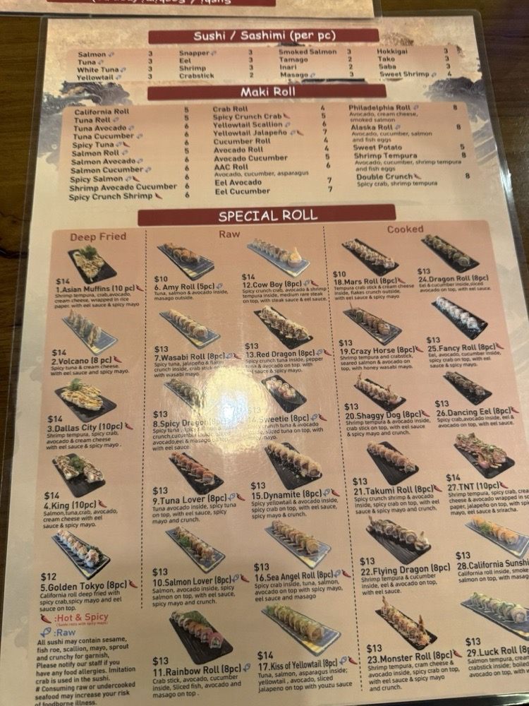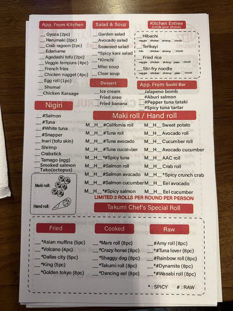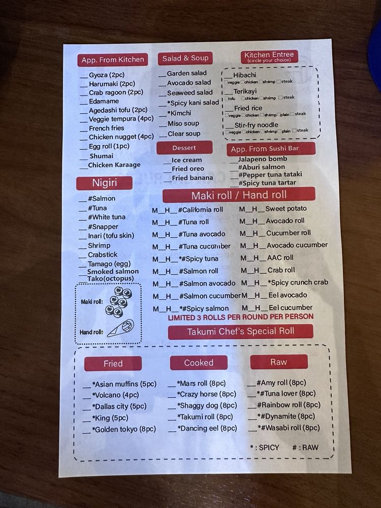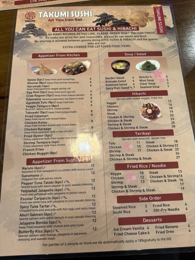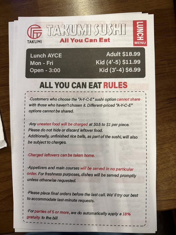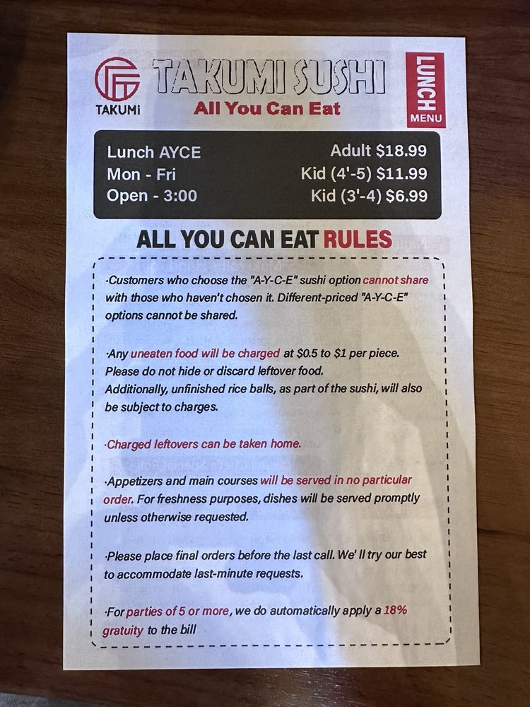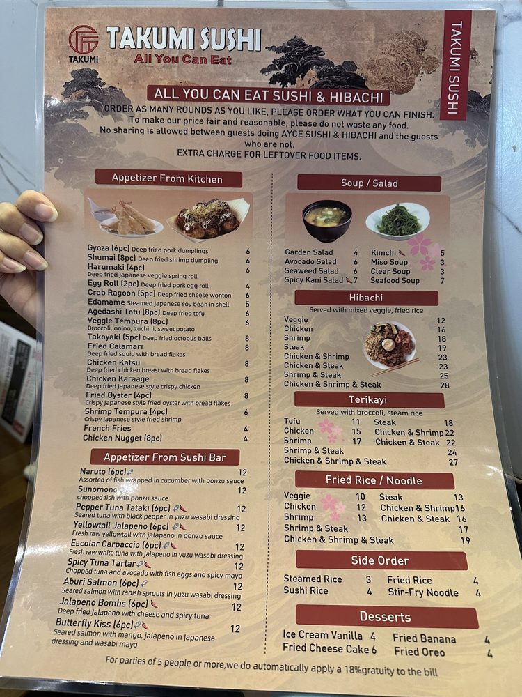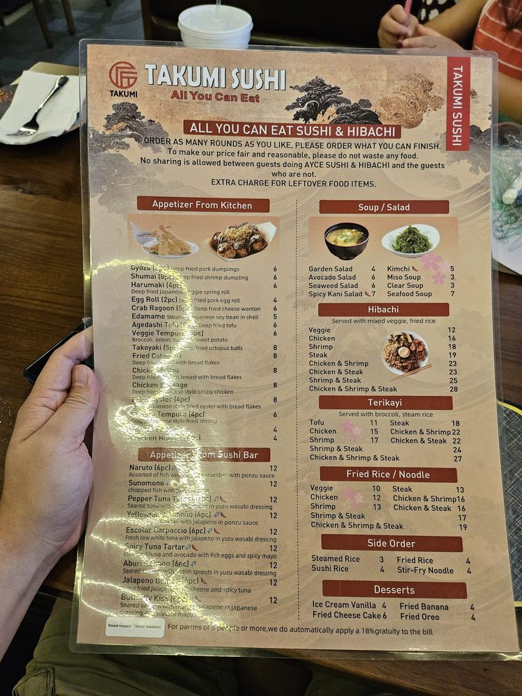 Introducing the menu at Takumi Sushi All You Can Eat, located in Dallas, TX, offers a variety of fresh and high-quality sushi options. Customers have praised the restaurant for its delicious fish and generous portions, making it a great value for money. The menu includes a range of sushi rolls, sashimi, hand rolls, and appetizers like shumai and gyoza. One standout feature is the inclusion of AYCE sashimi in the dinner menu, a rare and exciting offering for sushi lovers. The restaurant's modern vibe, friendly staff, and spacious seating make it a comfortable and enjoyable dining experience. Overall, Takumi Sushi All You Can Eat is highly recommended for those looking for a satisfying sushi meal at an affordable price.